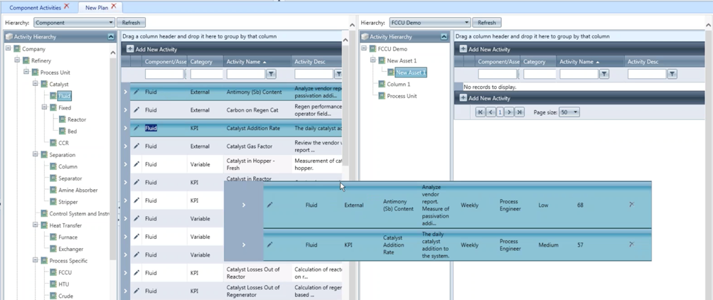 On the left of this display, select the components list, or another hierarchy to drag activities from, then click Refresh. On the right, select the plan which you would like to copy activities to, and click Refresh. You can now drag and drop assets, activities, parameters or targets to the plan.