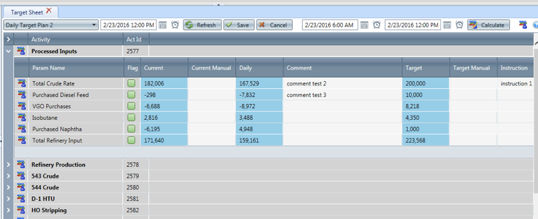We can see each activity (Process Inputs, Refinery Production etc.) with most of them collapsed (Use arrow at left of display), and the first activity expended. This activity lists all its parameters. The three types of data are in the blue columns; in this case: "Current" contains 6-hour average of PI data through formulas (hovering on the formulas would show the PI formula or query result), "Alternate" show 24 hours average of the previous day (from the yield accounting system) and "Target" shows the plan from the linear program.