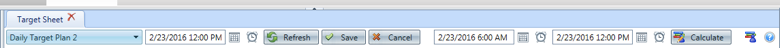 The user can select the monitoring plan (here "daily Target Plan 2"), pick an operating day, pull data from the database, save, cancel, adjust the time period within the operating day (this would impact the "function" defined in each parameter if applicable - example: Average). Upon pressing Calculate, all data would be retrieved automatically for the operating day and period. Make sure to save prior in case you want to roll comments, targets and instructions to the new day.