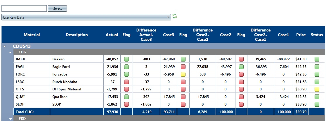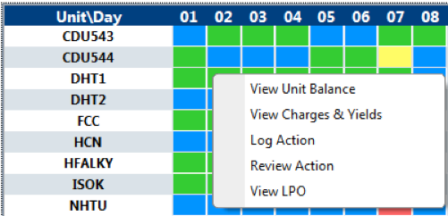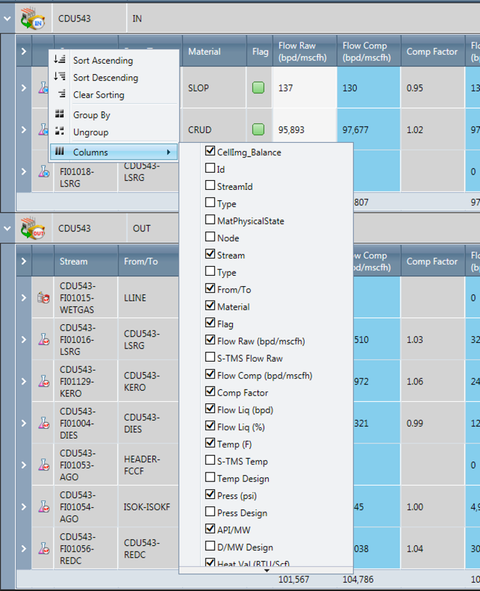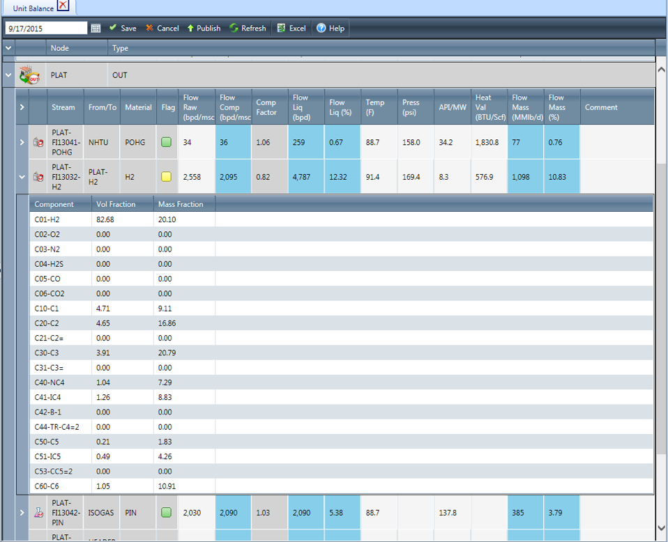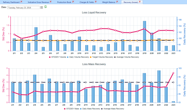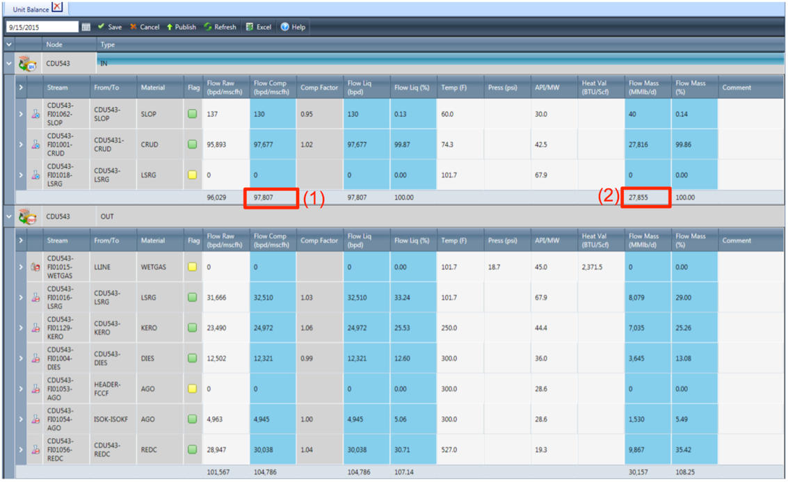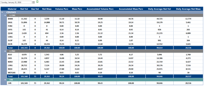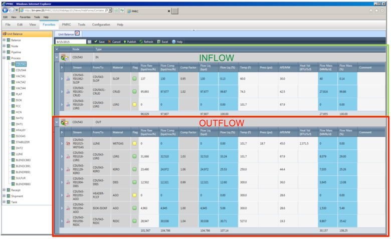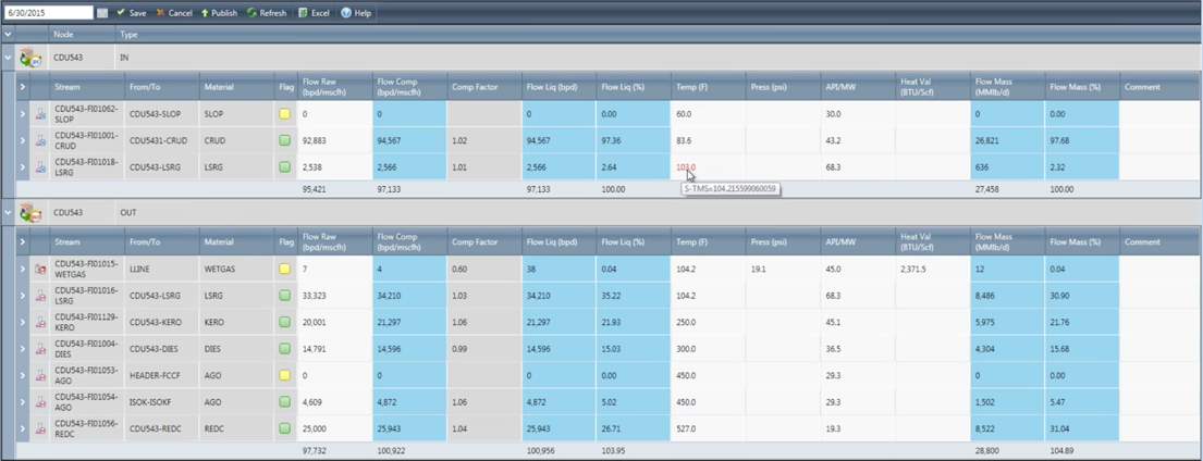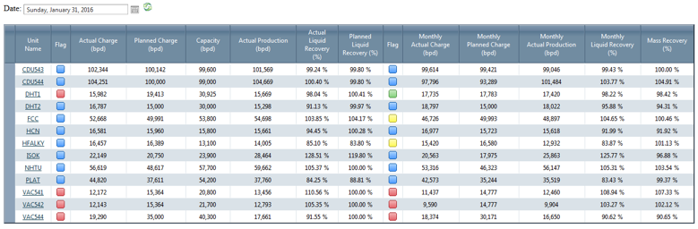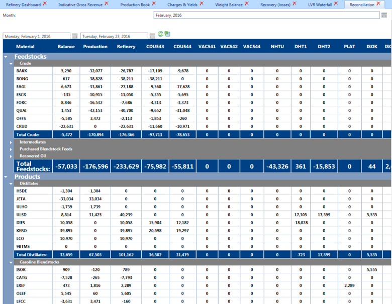 This set of displays presents each process unit side-by-side as defined in the yield accounting system or the preloaded volume reconciled data (preferred - see Reports Folder).