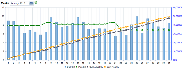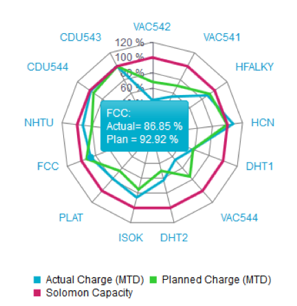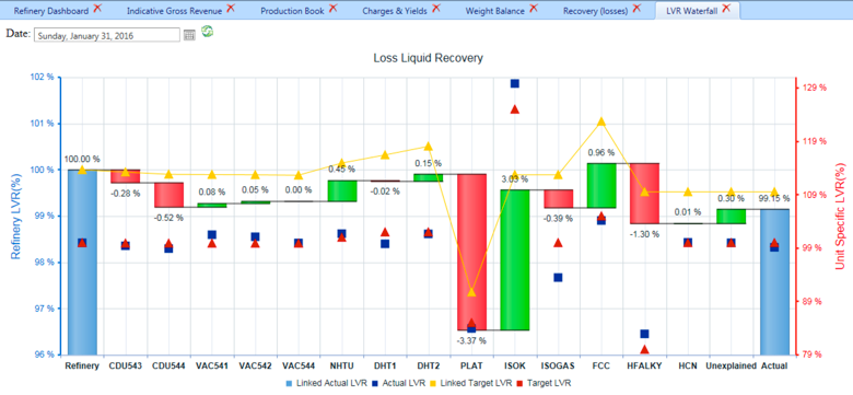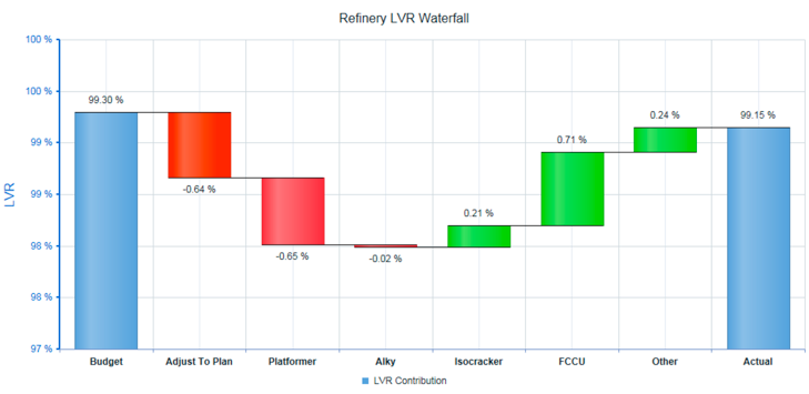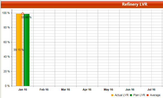 The waterfall graph in this section is calculated using the refinery budget value as the basis, rather than 100% basis, as used in the Recovery (Losses) LVR waterfall. This graph includes adjustments to the plan, and focuses on big LVR contribution units: Platformer, Alky, Isocracker, and FCCU. The "Other" column shows total unexplained loss. The actual column shows the total volume recovery of the refinery. This graphs data is currently entered manually.