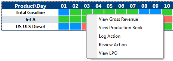 Columns with white cells are provided for collaboration purpose (standard in all views); it means they can be edited by users and saved. We provide manual override for "Current" and "Target". This would be for instance a way for the scheduler to alter a mid term target (week of month) and change it to a daily target. It also provides columns to enter instructions and to add comments during a collaborative work session. Finally, by hitting the person symbol, the user can access a registry to enter a Lost Profit Opportunity or an Action Item. All these fields can be saved through one command at the top.