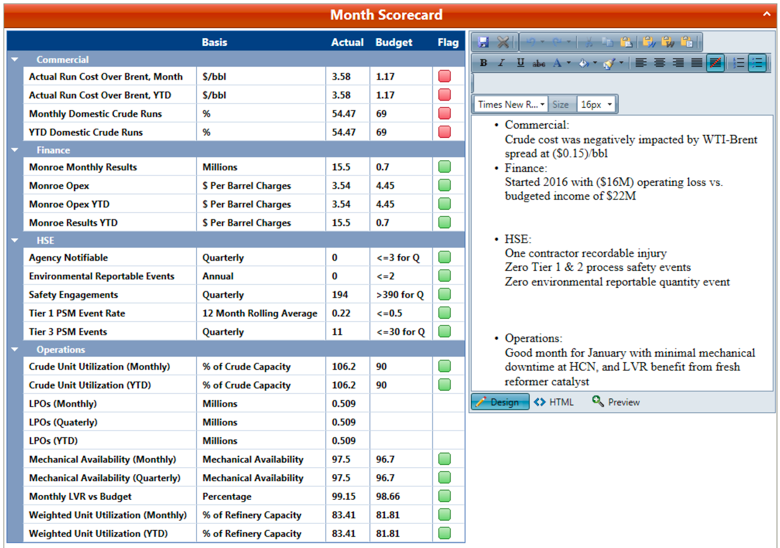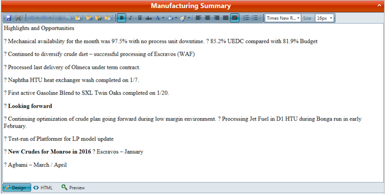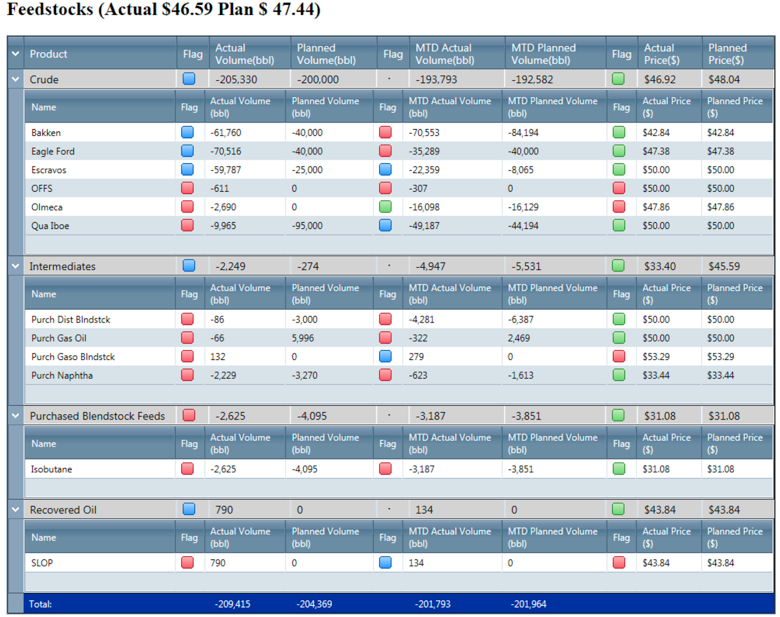 - The monthly plan reports obtained as output of the linear program Petro, which contains purchases, sales, unit charge & yields, blending information and prices/costs.