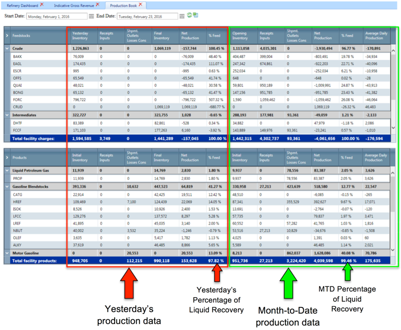 This report is similar to the production book; it displays all products and feedstocks with final production numbers. Select the start and end date, and click refresh. Each production month in the selected period is shown, with the month listed in the column heading.