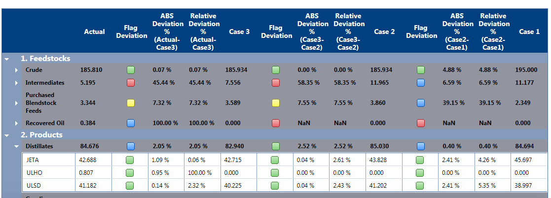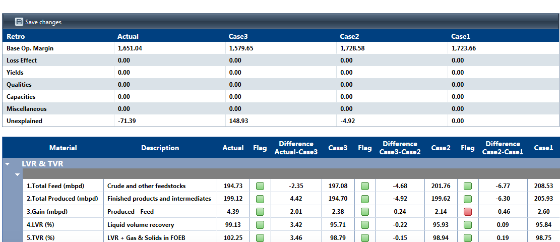 Backcast Fence Line sets up the analysis and contains section windows at the top that allow the user to define which LP case are assigned to Case 1, 2 and 3. PMRC manages the mapping between Actual and Plan systems, so it can display comparison data side by side. Users can run multiple backcast cases, load them into PMRC (through a Plan loader tool), and then decide which one is allocated to Case1, 2 and 3 for the study. Upon refreshing the screens, the base comparison will be shown for the gross margin, including key parameters such as volume recovery and crude charge. After the analysis of differences has been performed, the user can allocate the gross margin differences between: Actual and Case 3; Case 3 and Case 2; Case 2 and Case 2. The differences are displayed with four preset root causes (losses, yields, qualities, capacities) - the balance is calculated automatically.