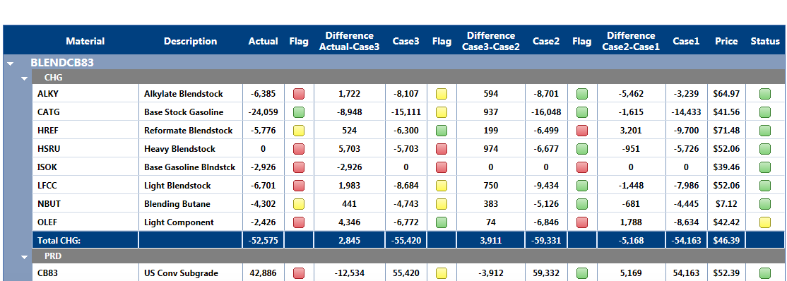 This set of displays presents each blend side-by-side as defined in the yield accounting system. Here again, the volume-reconciled information can be used instead of the original STMS data if minor changes are made in the blend columns.