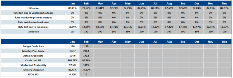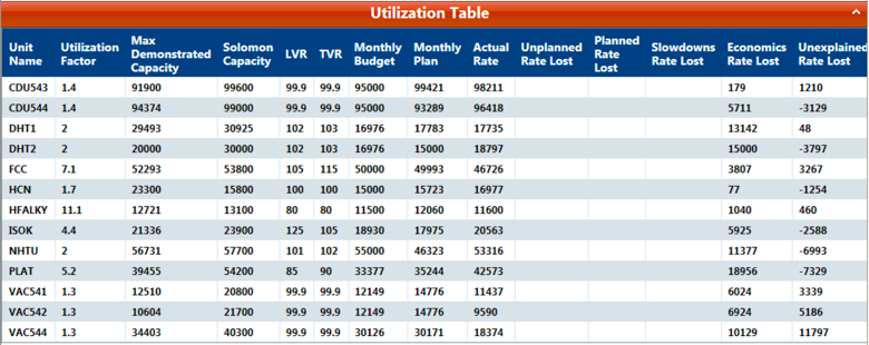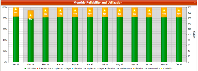 This graph is a visual representation of monthly utilization values, including percentages of rate lost and the underlying causes. It uses the LPO registry to consolidate the barrels lost by type. The barrels lost due to economics are calculated as the difference between the plan unit throughput and Solomon capacity The first table below displays the percentages of rate loss and underlying causes. The second table displays numbers and percentages for the following: