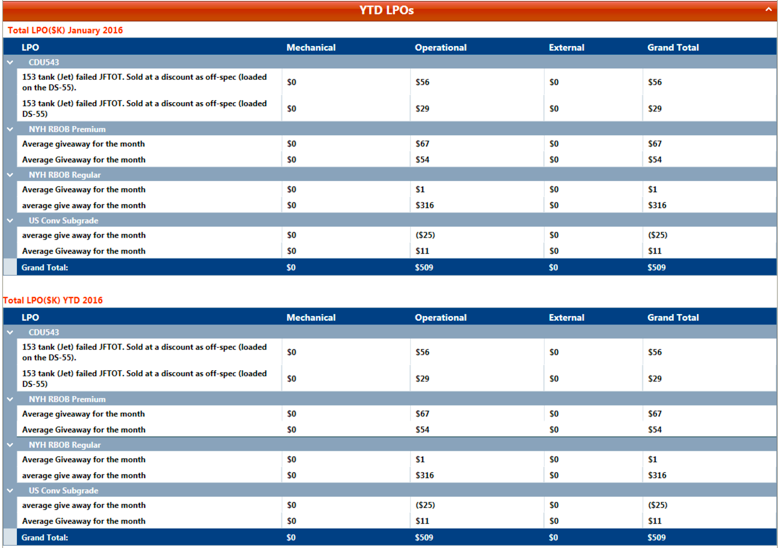 In these two tables, lost profit opportunities are displayed in thousands of dollars: In the first table, the selected period is shown; in the second table, the year-to-date is shown. This graph is comprised of LPO data provided by the user in the LPO Summary Dashboard, described in section 7.3.1.