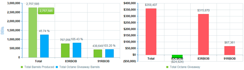 The bar graph to the left displays the barrels produced in green, and the octane giveaway barrels in blue. The bar graph to the right displays total octane giveaway in dollar amount. Where there are negative octane giveaways, a gain is shown, as is the case for 83CBOB.