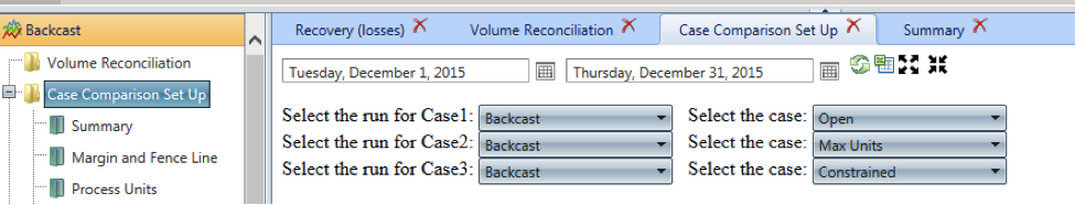 Case comparison set up controls which cases are used for the comparison. Theses cases are stored in PMRC as any other plan (output from the LP) but with a type Backcast. By default, the available cases are Open, Max Units, and Constrained, associated to Case 1, 2 and 3. The last Case with that ID for that time period will be the one used. Over time, the study could include other cases that can be associated to Case 1, 2 or 3 -- for now, we just allowed one additional called “Blue Sky” for a even less restricted LP than Open. In regular backcast mode, the default Cases set up does not need to be altered (see below).