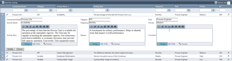 to edit an activity, parameter or target. From this screen, authorized users can edit: asset name, activity name, description, category, frequency, reason, role, priority and comments. Click the Update button to save changes.