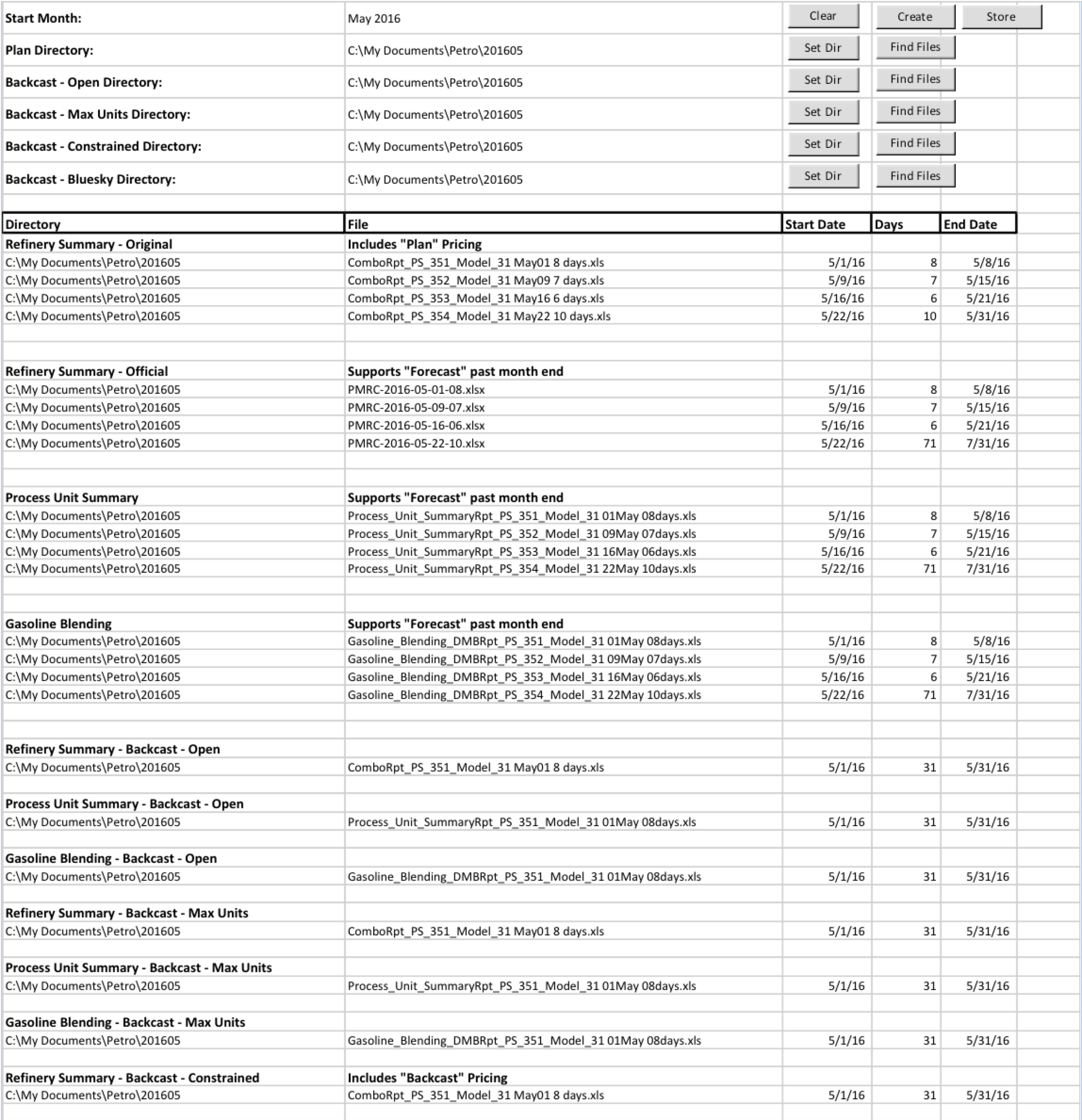 "Comborpt" contains purchases, sales and prices. "Process Unit Summary" and "Gasoline Blending" contain process unit charge and yields as well as components blended for each finished gasoline grade. The three files when associated to a planning period form the "Original" plan. PMRC is a file that allows for small edits of the purchases and sales in order to match the plant better. PMRC loads as the "official" plan but does not reconcile with process units or blends (comborpt - the Original - is reconciled with process units and blends).