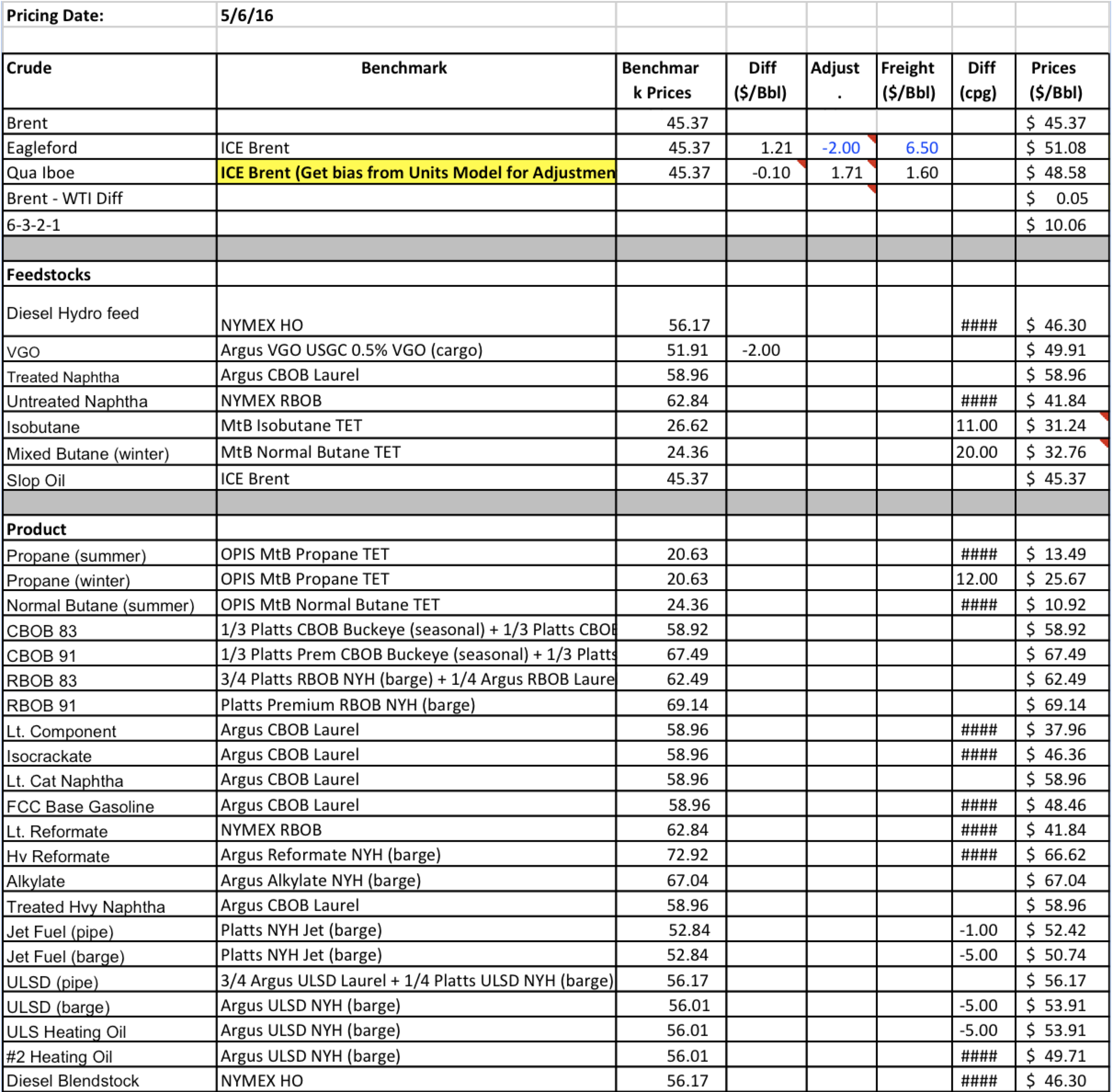 The process is entirely automated. Every time the dashboard sheet is saved in Atlanta, a copy of the pricing sheet (see pricing sheet below) is mailed to a Trainer outlook mailbox from which is treated on an hourly time schedule to insert directly in PMRC. Contact the IT department for troubleshooting in case Actual prices do not seem to be updated. This would be noticed if Actual prices for a commodity such as CBOB83 are equal to planned prices (the PMRC logic in order to avoid any false conclusion due to lack of prices).